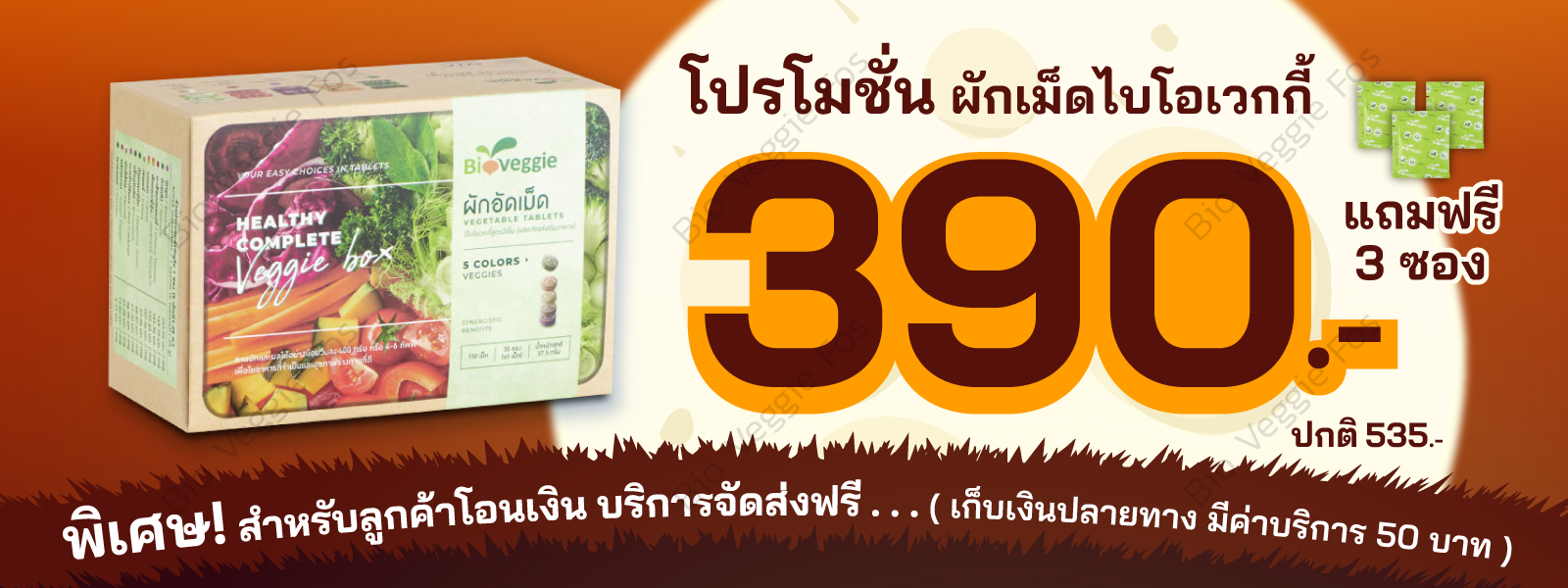โปรโมชั่น โปรโมชั่นผักเม็ด Bioveggie ช่องทางการสั่งซื้อสินค้า สั่งซื้อกับเจ้าหน้าที่ 084-880-1771 สั่งซื้อผ่าน LINE ID :@c8005 ช่องทางการชำระเงิน การจัดส่งสินค้า/ราคาส่งสินค้า ✿บริการจัดส่งฟรี EMS ทั่วประเทศ ✿มีบริการจัดส่งเก็บเงินปลาย ค่าจัดส่ง 50 บาท รายละเอียดการจัดส่งสินค้าเพิ่มเติ่ม ✿คลิก✿